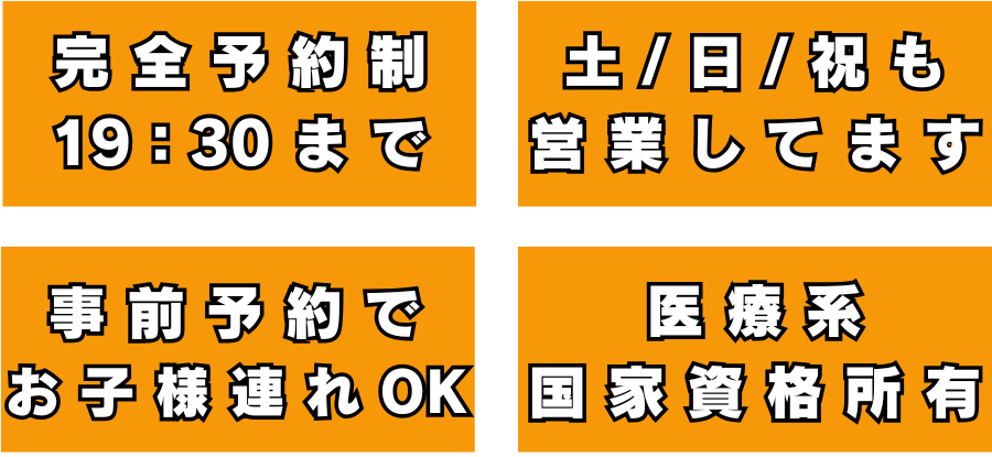 また、妊婦さんに対応した施術方法もございますので、妊娠中の方でも安心してお越しいただく事が出来ます。