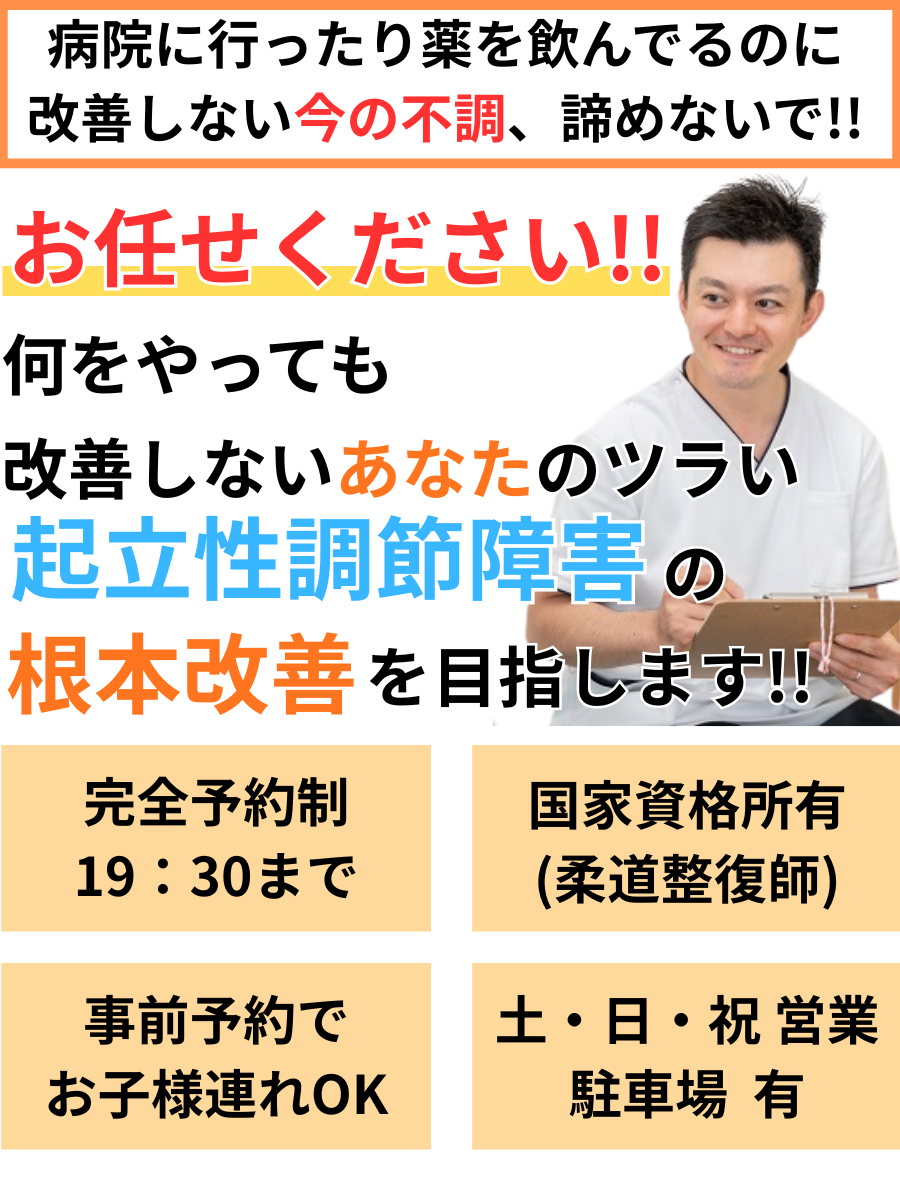 身体のプロとしての証である国家資格を持ち、多くの知識と施術経験を持つ専門家があなたの症状に真摯に向き合う整体院せせらぎに来院し、もう二度と今の起立性調節障害を我慢することない人生を手に入れる道。